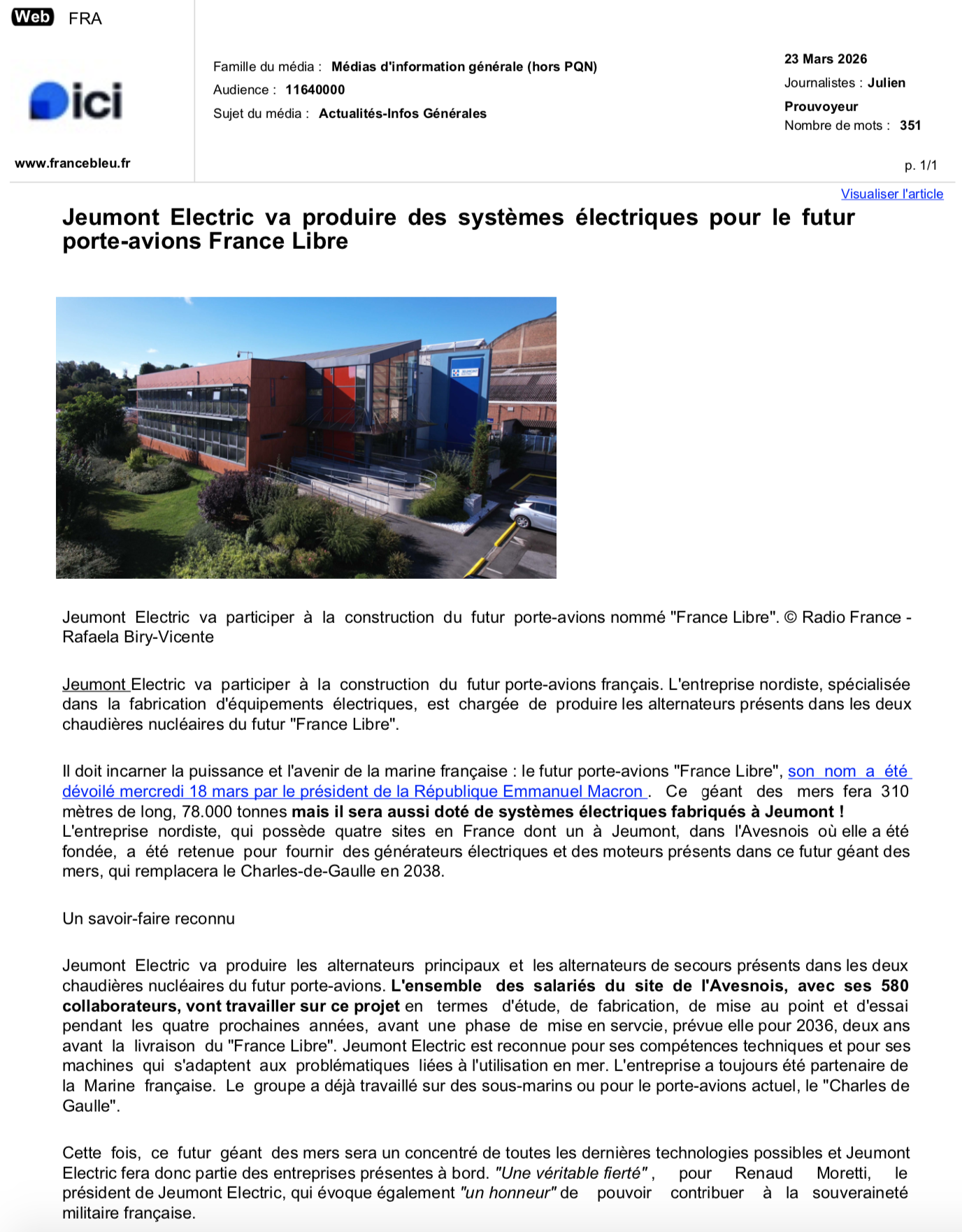 20 mars 2026 La PME nordiste JEUMONT Electric embarque dans le programme du porte-avion France-Libre -